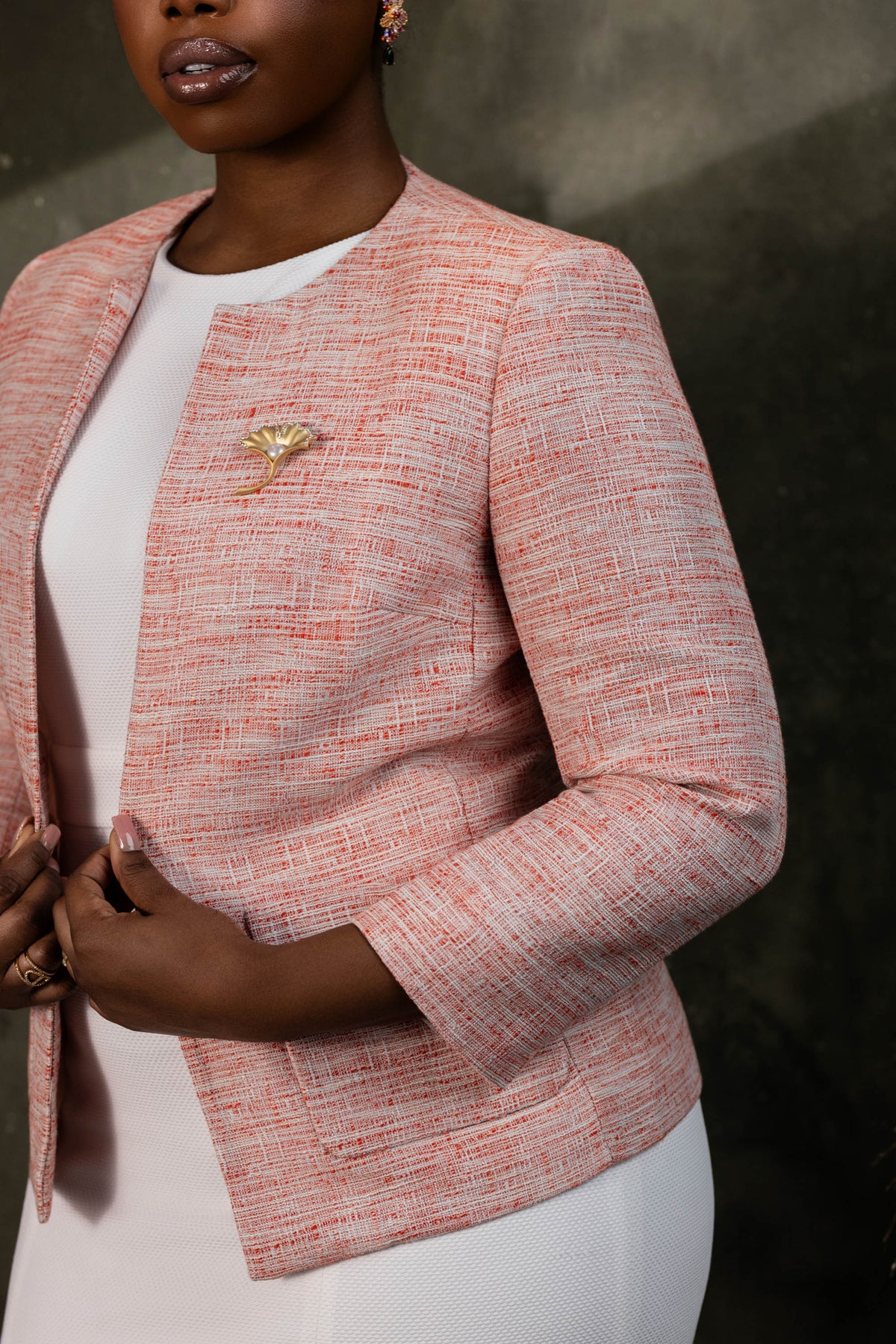 The Marlowe Tweed Jacket is the perfect blend of elegance and ease. Crafted from soft, high-quality polyester, it’s designed to keep you feeling both comfortable and effortlessly chic.