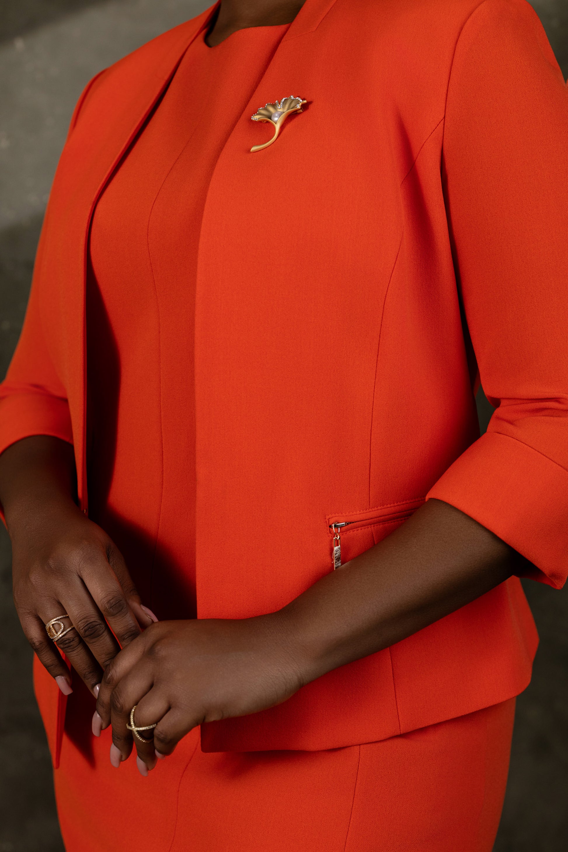 Polish off your workwear look with effortless sophistication. The Sinclair Jacket is a chic, versatile layer designed to take you seamlessly from desk to dinner. Crafted in a bold Valencia hue, it features a sleek stand collar, a subtle hook-and-eye closure, and modern zip-front pockets. The 3/4 sleeves lend a contemporary tailored finish, making it the perfect piece to pair with trousers, skirts, or dresses.